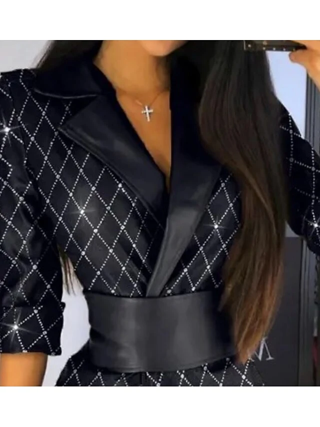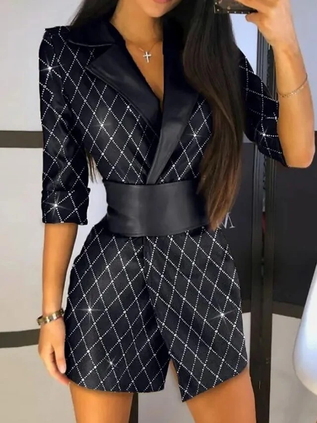 Women‘s Black Dress And Jacket Set Short Mini Dress Mini Dress Black 3/4 Length Sleeve Plaid Print Fall Winter Autumn Shirt Collar Stylish 2023 S M L XL 2XL 3XL