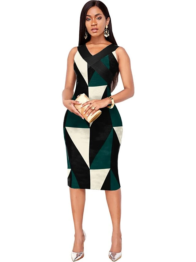 Women’s Bodycon Sheath Dress Print Dress Midi Dress Dark Green Sleeveless Geometric Print Summer Spring V Neck Stylish Slim 2023 S M L XL 2XL 3XL
