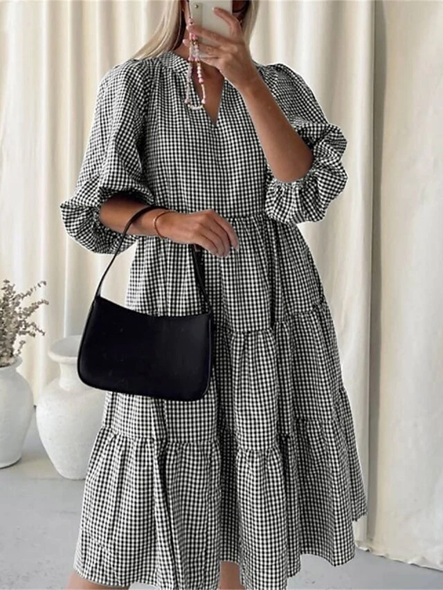 Women’s Casual Dress Cotton Dress Midi Dress Cotton Basic Classic Outdoor Daily Vacation V Neck Print Long Sleeve Spring Fall Winter 2023 Loose Fit Black Yellow Red Plaid S M L XL 2XL