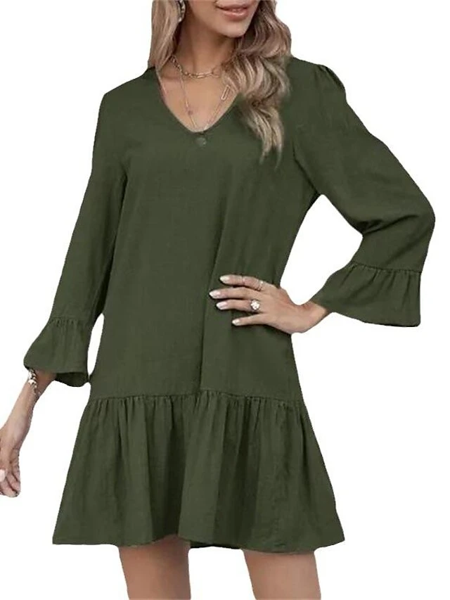 Women’s Casual Dress Cotton Dress Swing Dress Cotton Blend Fashion Classic Holiday Weekend Beaches V Neck Pleated Ruffle Long Sleeve Navy Blue Brown Green S M L XL 2XL