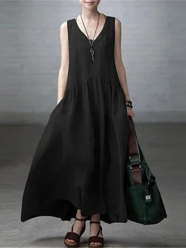 Women’s Casual Dress Cotton Linen Dress A Line Dress Maxi Long Dress Cotton Blend Basic Modern Outdoor Daily V Neck Pocket Sleeveless Summer Spring 2023 Regular Fit ArmyGreen Black Yellow Pure Color