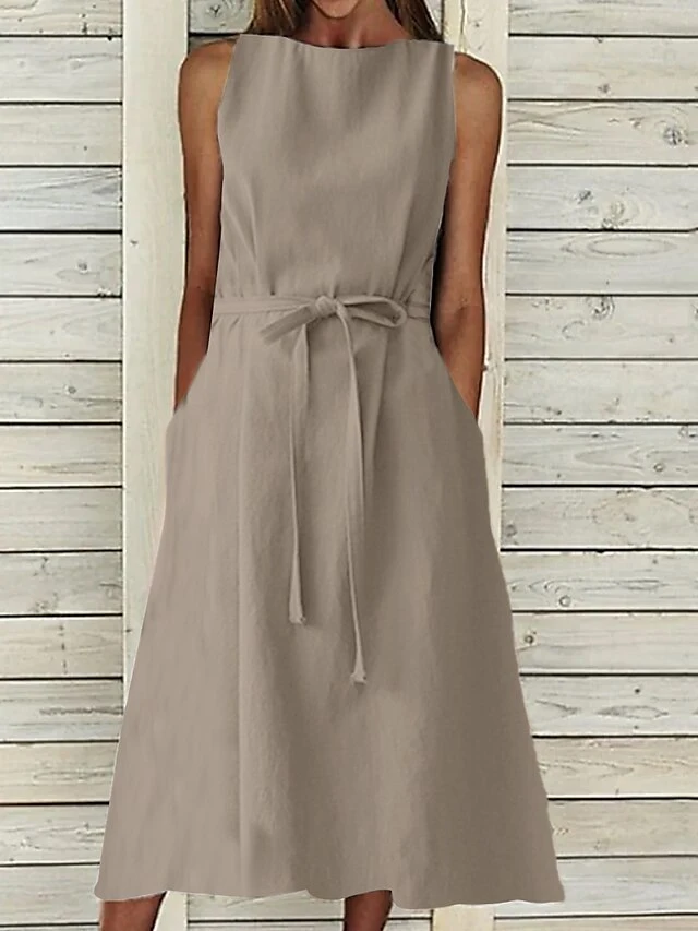 Women’s Casual Dress Cotton Linen Dress A Line Dress Midi Dress Cotton And Linen Basic Classic Outdoor Daily Vacation Crew Neck Lace Up Sleeveless Summer Spring 2023 Regular Fit Navy Blue Orange