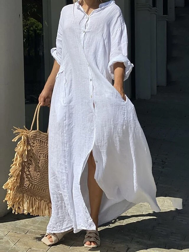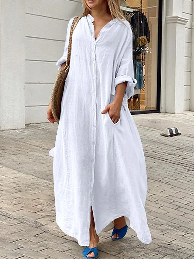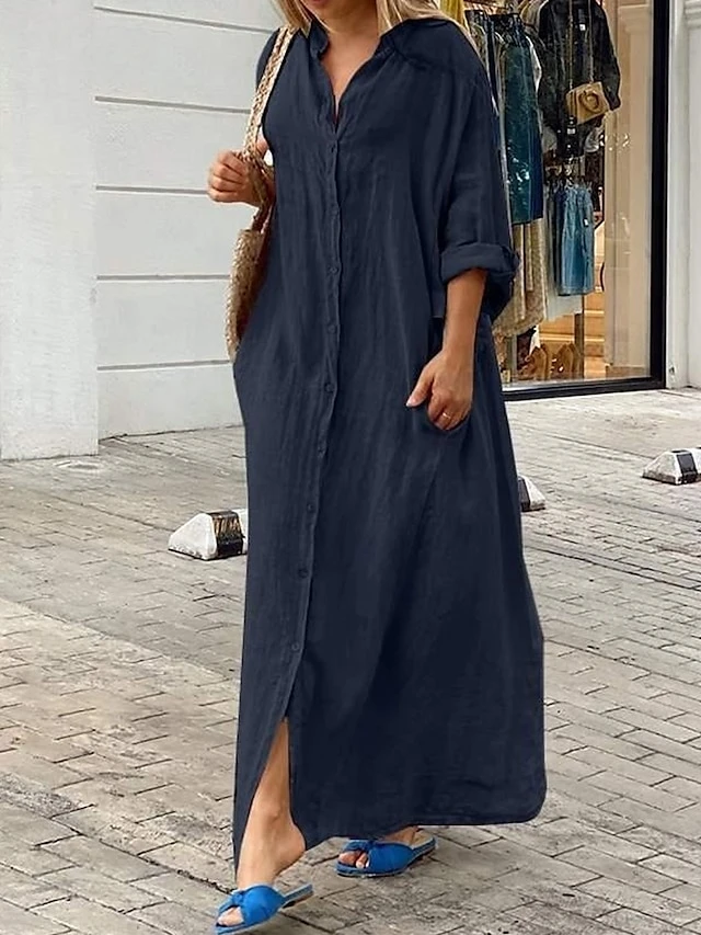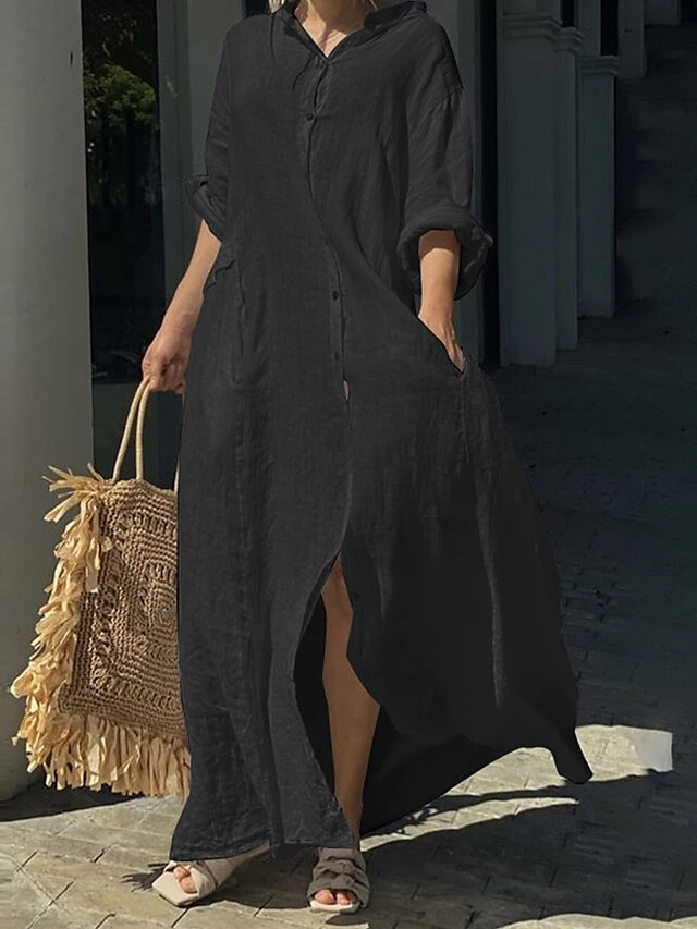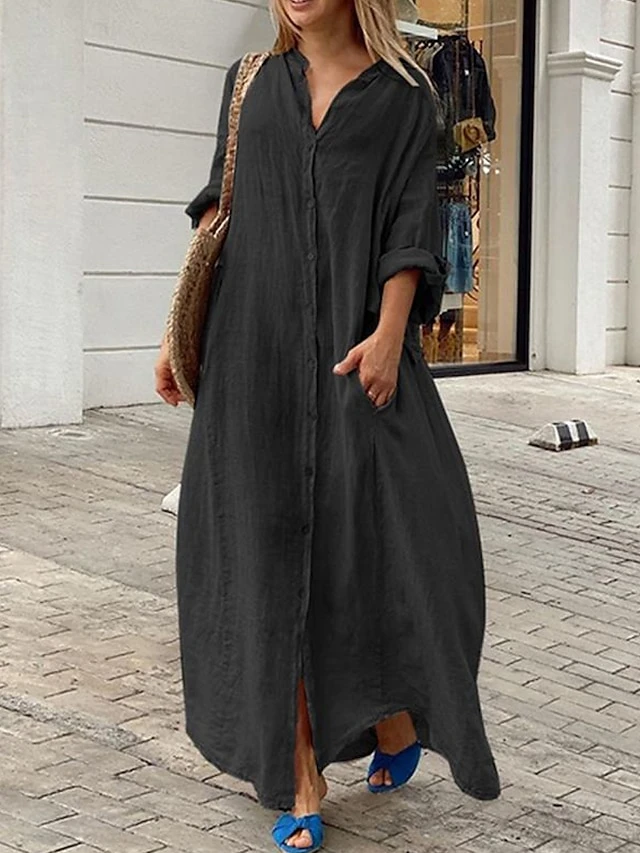 Women’s Casual Dress Cotton Linen Dress Black Dress Maxi Long Dress Linen / Cotton Blend Fashion Daily Outdoor Daily Vacation Stand Collar Button Pocket Long Sleeve Fall Autumn 2023 Loose Fit Black