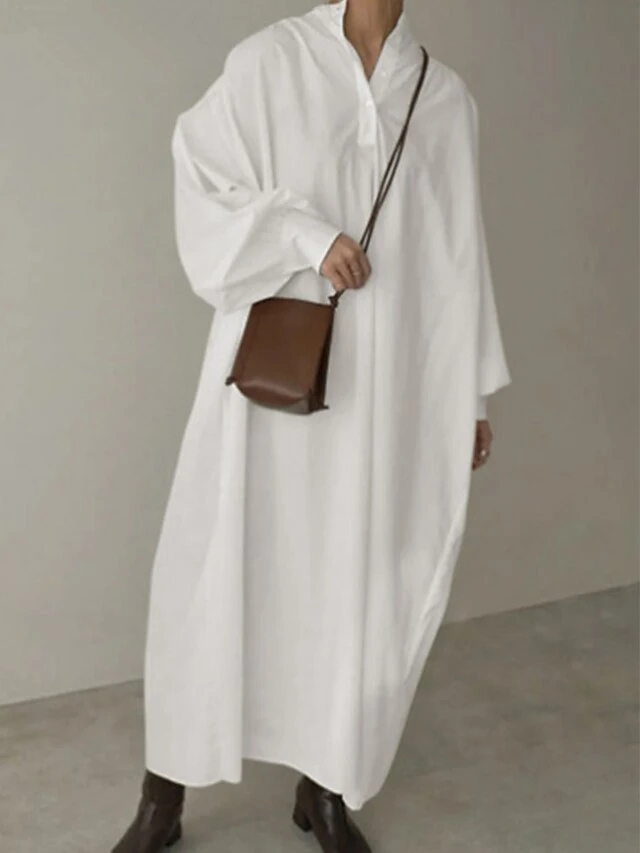 Women’s Casual Dress Cotton Linen Dress Loose Dress Maxi Long Dress Polyester Daily Casual Daily Outdoor Daily Holiday Stand Collar Button Long Sleeve Spring Fall Winter 2023 Loose Fit ArmyGreen