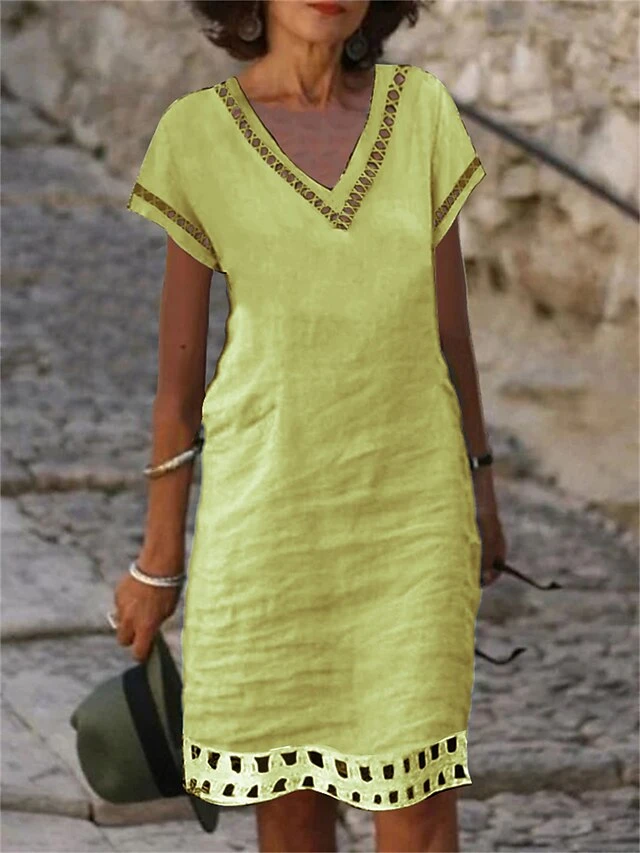 Women’s Casual Dress Cotton Linen Dress Shift Dress Midi Dress Cotton Blend Fashion Basic Outdoor Daily Vacation V Neck Lace Up Hollow Out Short Sleeve Summer Spring 2023 Loose Fit Light Blue White