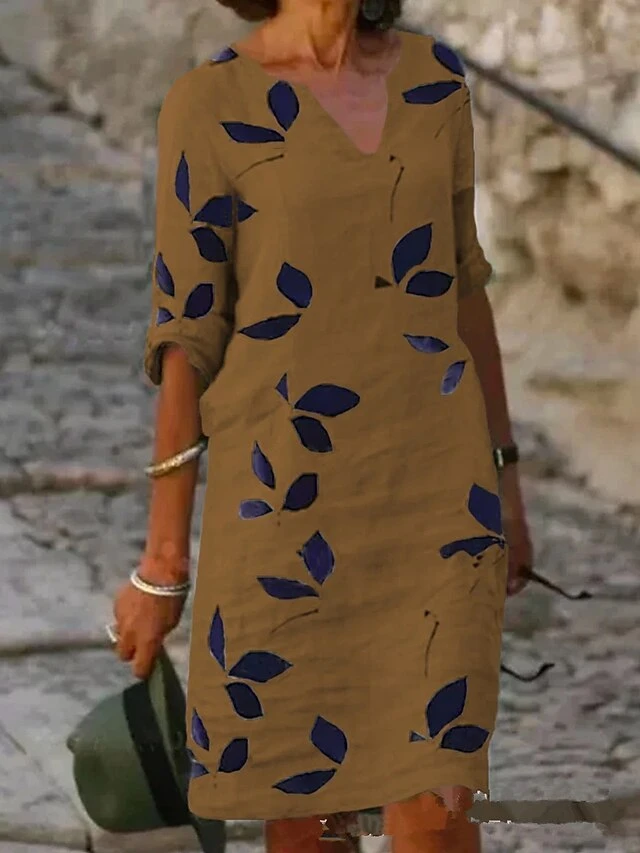 Women’s Casual Dress Cotton Linen Dress Shift Dress Midi Dress Cotton Blend Fashion Modern Outdoor Daily Vacation V Neck Print Half Sleeve Summer Spring 2023 Regular Fit White Purple Brown Leaf S M L