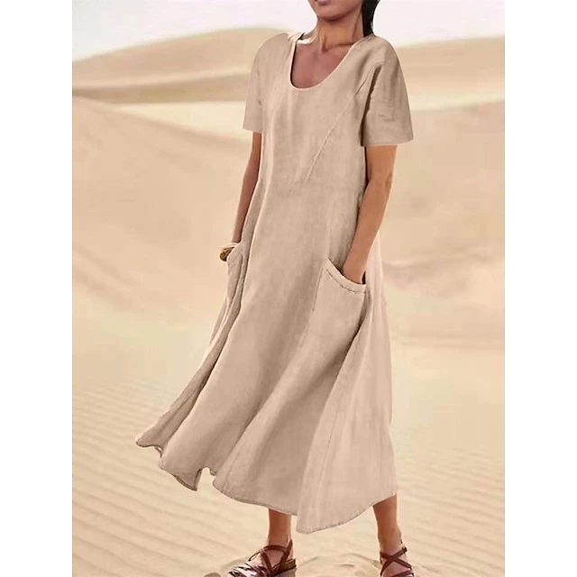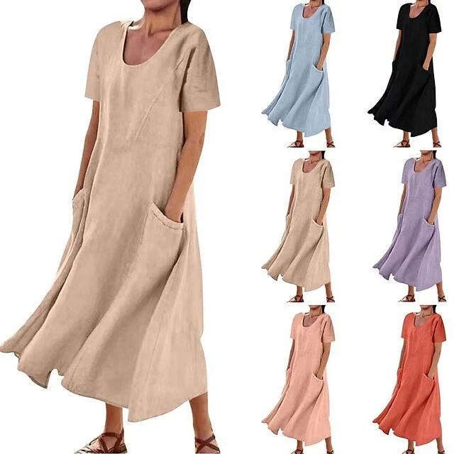 Women’s Casual Dress Cotton Linen Dress Swing Dress Maxi Long Dress Linen Cotton Blend Fashion Classic Outdoor Daily Vacation Crew Neck Pocket Short Sleeve Summer Spring 2023 Loose Fit Black Pink Sky