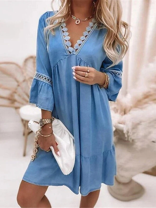 Women’s Casual Dress Cotton Linen Dress Swing Dress Midi Dress Cotton Blend Fashion Basic Outdoor Daily V Neck Patchwork Eyelet 3/4 Length Sleeve Summer Spring Fall 2023 Regular Fit Blue Plain S M L