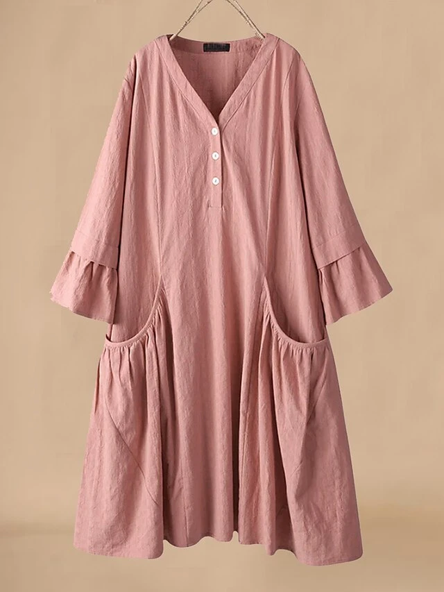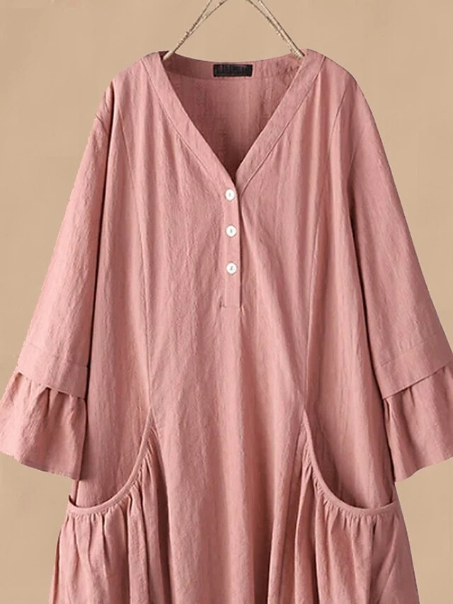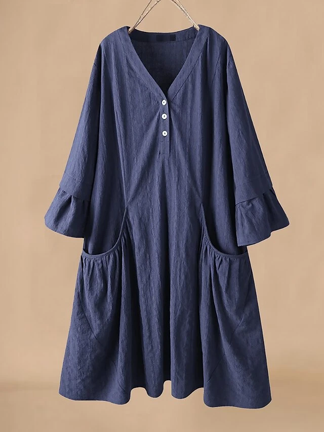 Women’s Casual Dress Cotton Linen Dress Swing Dress Midi Dress Polyester Basic Classic Outdoor Daily Vacation V Neck Ruffle Button 3/4 Length Sleeve Spring Fall Autumn 2023 Loose Fit Pink Navy Blue
