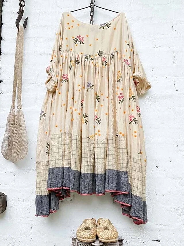 Women’s Casual Dress Cotton Linen Dress Swing Dress Mini Dress Polyester Basic Casual Outdoor Daily Vacation Crew Neck Ruched Patchwork Half Sleeve Summer Spring Fall 2023 Regular Fit Khaki Plaid