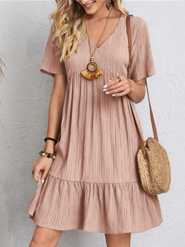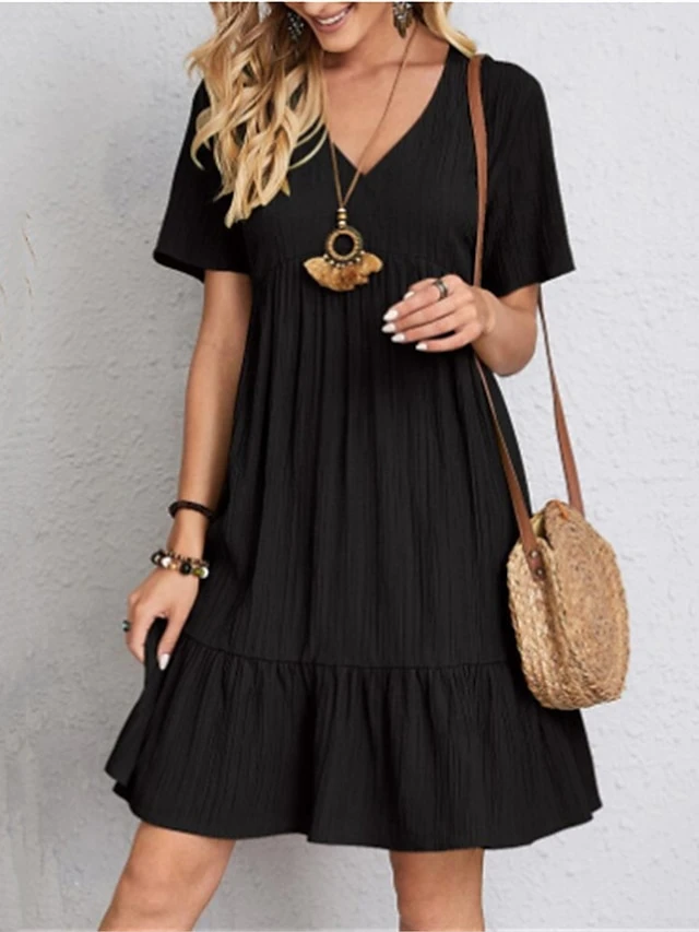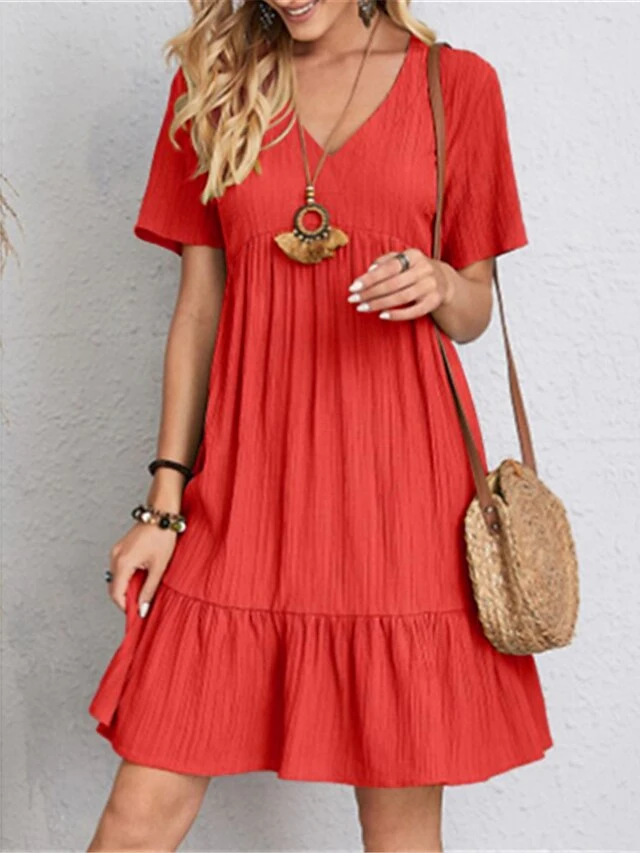 Women’s Casual Dress Cotton Linen Dress Swing Dress Mini Dress Polyester Basic Classic Outdoor Daily Vacation V Neck Ruffle Short Sleeve Summer Spring 2023 Regular Fit Black Pink Red Plain S M L XL