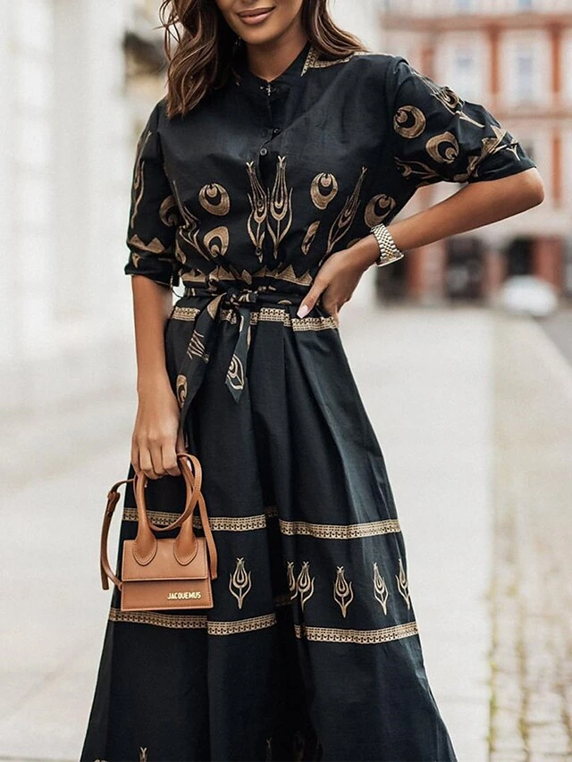 Women’s Casual Dress Cotton Linen Dress White Dress Midi Dress Polyester Fashion Gothic Outdoor Daily Vacation Stand Collar Print Half Sleeve Summer Spring Fall 2023 Loose Fit Black Green Apricot