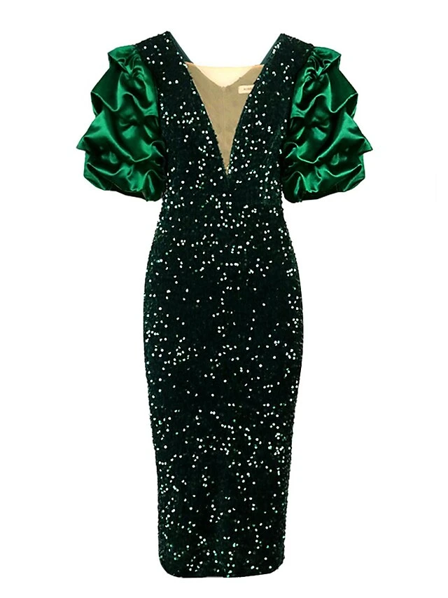 Women‘s Christmas Party Dress Sequin Dress Cocktail Dress Midi Dress Red Dark Green Short Sleeve Pure Color Sparkly Glitter Sequins Summer Spring Fall V Neck Fashion Wedding Guest Vacation Summer