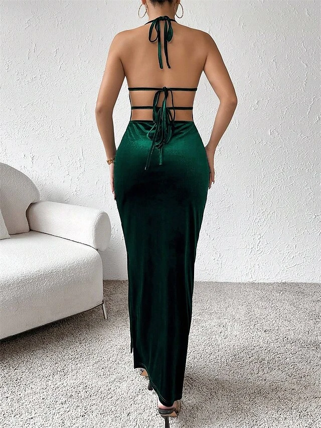 Women‘s Christmas Prom Dress Party Dress Velvet Dress Long Dress Maxi Dress Dark Green Sleeveless Pure Color Backless Spring Fall Winter Halter Neck Fashion Birthday Evening Party Wedding Guest 2023