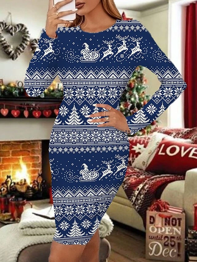 Women’s Christmas Work Dress Bodycon Mini Dress Blue Wine Navy Blue Long Sleeve Cat Elk Snowflake Print Winter Fall Crew Neck Vacation Stylish 2022 S M L XL XXL 3XL 4XL 5XL 6XL / Sheath Dress
