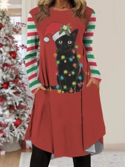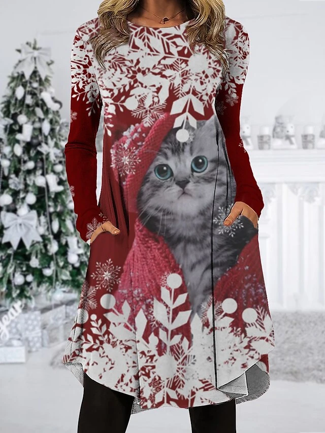Women’s Christmas Work Dress Casual Dress Fashion Winter DressDaily Midi Dress Pocket Print Crew Neck Long Sleeve Cat Snowflake Regular Fit White Wine Red Fall Winter S M L XL XXL