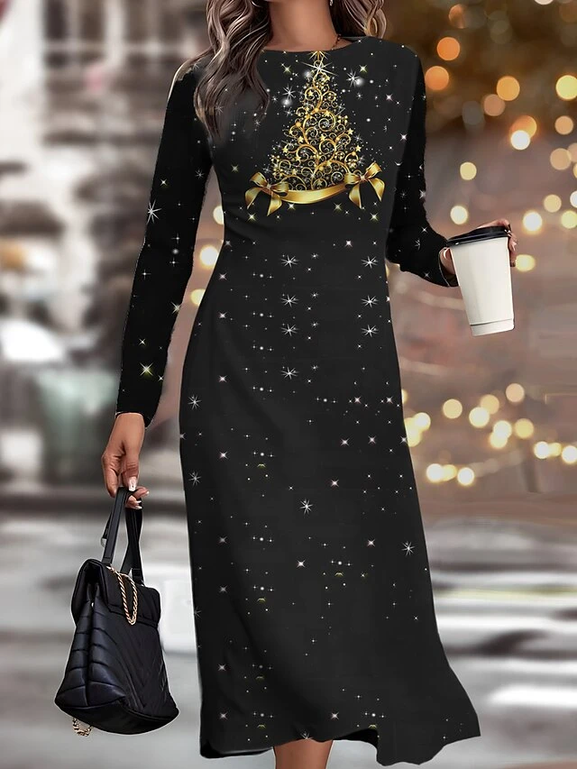 Women’s Christmas Work Dress Casual Dress Semi Formal Dress Fashion Winter Dress Daily Midi Dress Print Crew Neck Long Sleeve Elk Snowflake Slim Black Wine Blue Fall Winter S M L XL XXL