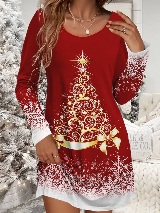 Women’s Christmas Work Dress Casual Dress Winter Dress Daily Mini Dress Print Crew Neck Long Sleeve Tree Loose Fit Wine Navy Blue Brown Fall Winter