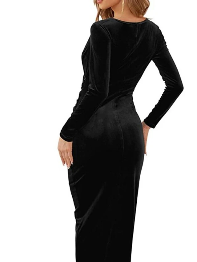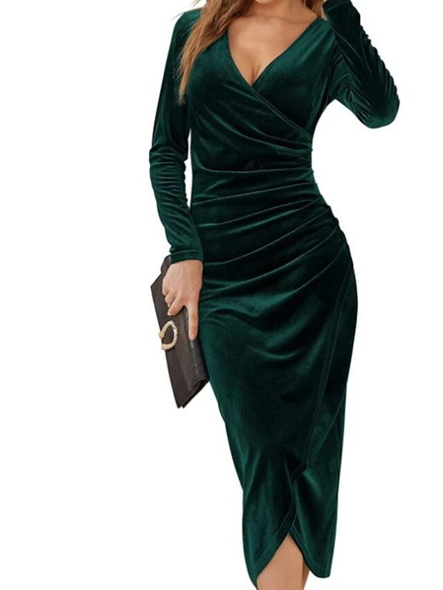 Women’s Cocktail Party Dress Green Velvet Dress Black Dress Wedding Guest Dress Bodycon Midi Dress Purple Wine Dark Long Sleeve Pure Color Ruched Split V Neck