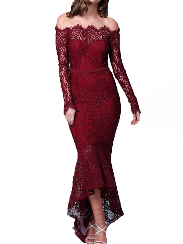 Women‘s Cocktail Party Dress Wedding Guest Dress Lace Dress Midi Dress Black White Wine Long Sleeve Pure Color Lace Winter Fall Autumn Off Shoulder Elegant Winter Dress Fall Dress 2023 S M L XL