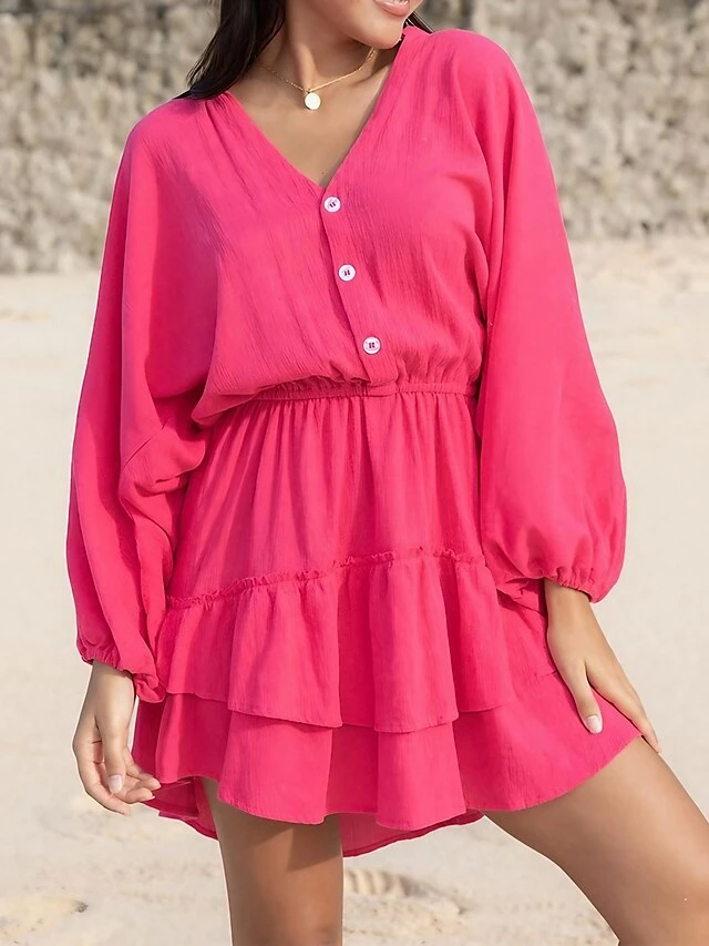 Women’s Cotton Linen Dress A Line Dress Loose Dress Mini Dress Linen Cotton Blend Daily Modern Style Daily Holiday Date V Neck Ruffle Button Long Sleeve Spring Fall Autumn 2023 Loose Fit Orange Rose
