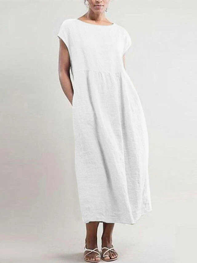 Women’s Cotton Linen Dress A Line Dress Maxi Long Dress Cotton Blend Basic Casual Daily Vacation Crew Neck Patchwork Pocket Short Sleeve Summer Spring Linen Loose Fit Black White Pink Pure Color S M
