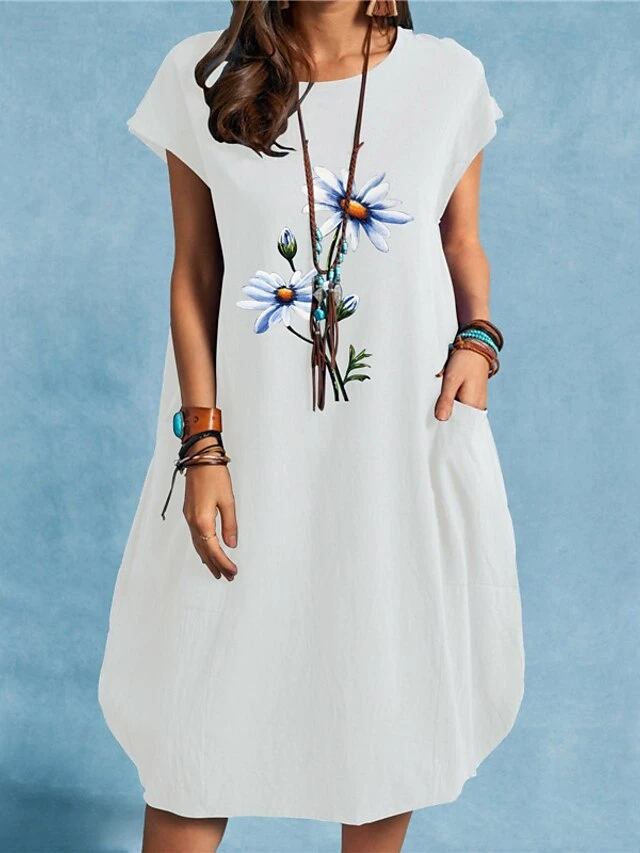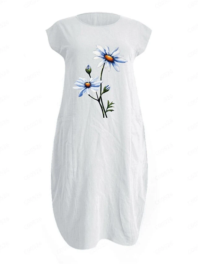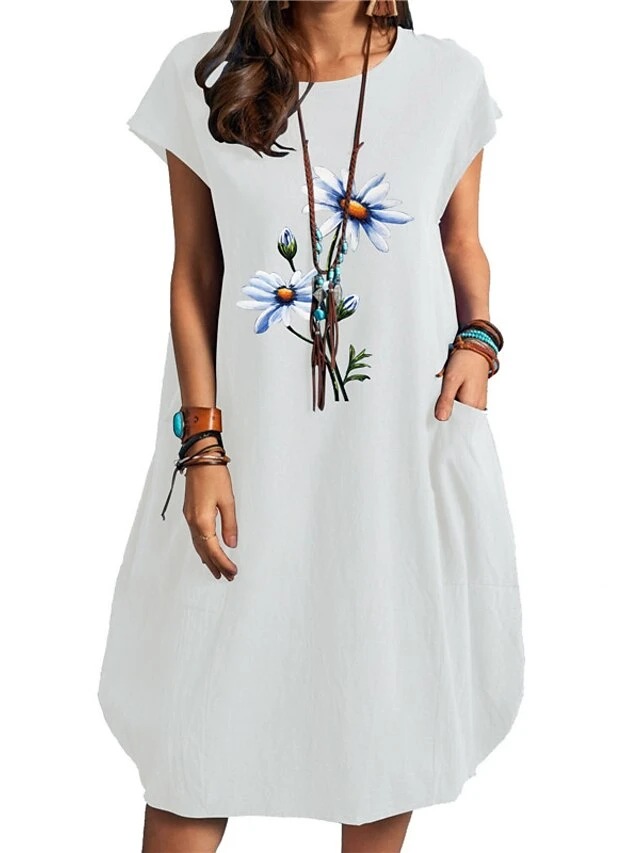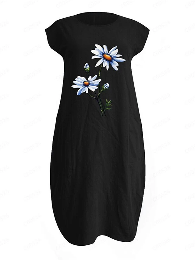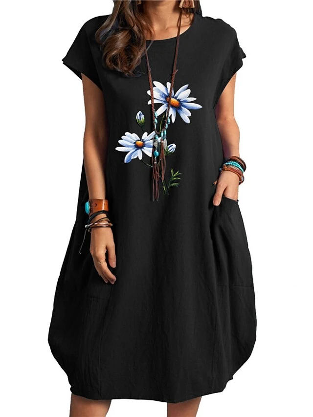 Women’s Cotton Linen Dress Midi Dress Linen Cotton Blend Casual Outdoor Daily Vacation Crew Neck Pocket Rolled Cuff Short Sleeve Summer Spring 2023 Loose Fit Black White Navy Blue Floral S M L XL XXL