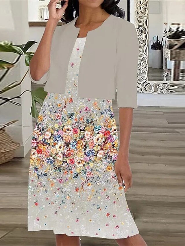 Women’s Dress Set Two Piece Dress A Line Dress Midi Dress Black Pink Gray 3/4 Length Sleeve Floral Print Summer Spring Crew Neck Elegant Loose Fit 2023 S M L XL XXL