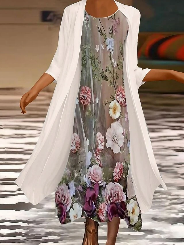 Women’s Dress Set Two Piece Dress Chiffon Dress Midi Dress Beige 3/4 Length Sleeve Floral Chiffon Fall Winter Autumn Crew Neck Stylish Loose Fit 2023 M L XL XXL 3XL 4XL 5XL