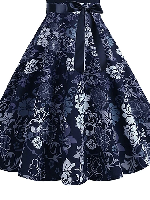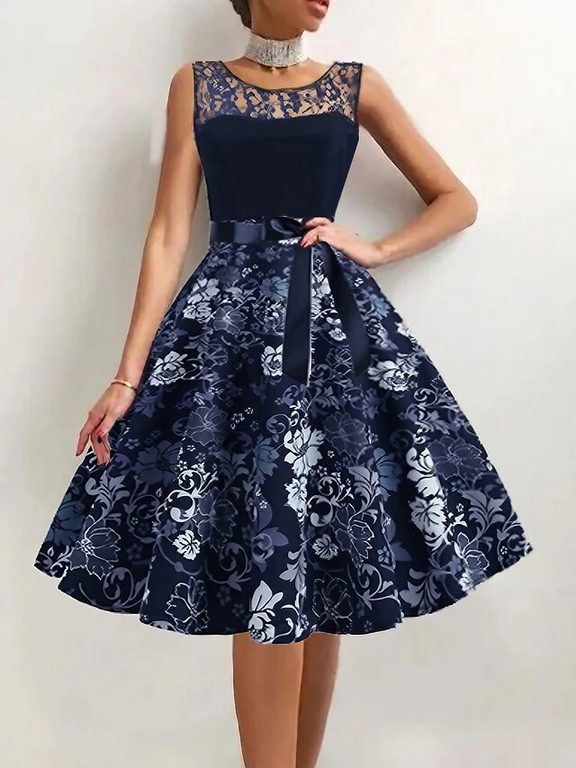 Women’s Elegant Retro Vintage Tea Dresses Swing Dress Midi Dress Party Birthday Lace Bow Floral Crew Neck Sleeveless Regular Fit Spring Summer 2023 Dark Blue S M L XL