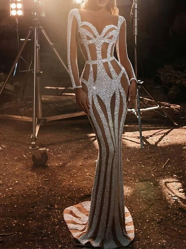 Women‘s Formal Party Dress Sequin Dress Long Dress Maxi Dress Silver Long Sleeve Pure Color Sequins Winter Fall Crew Neck Stylish Hot Fall Dress S M L XL XXL / Winter Dress