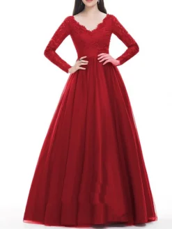 Women‘s Formal Party Dress Wedding Guest Dress Lace Dress Sheath Dress Long Dress Maxi Dress Red Long Sleeve Pure Color Lace Winter Fall Autumn V Neck Winter Dress Slim S M L XL