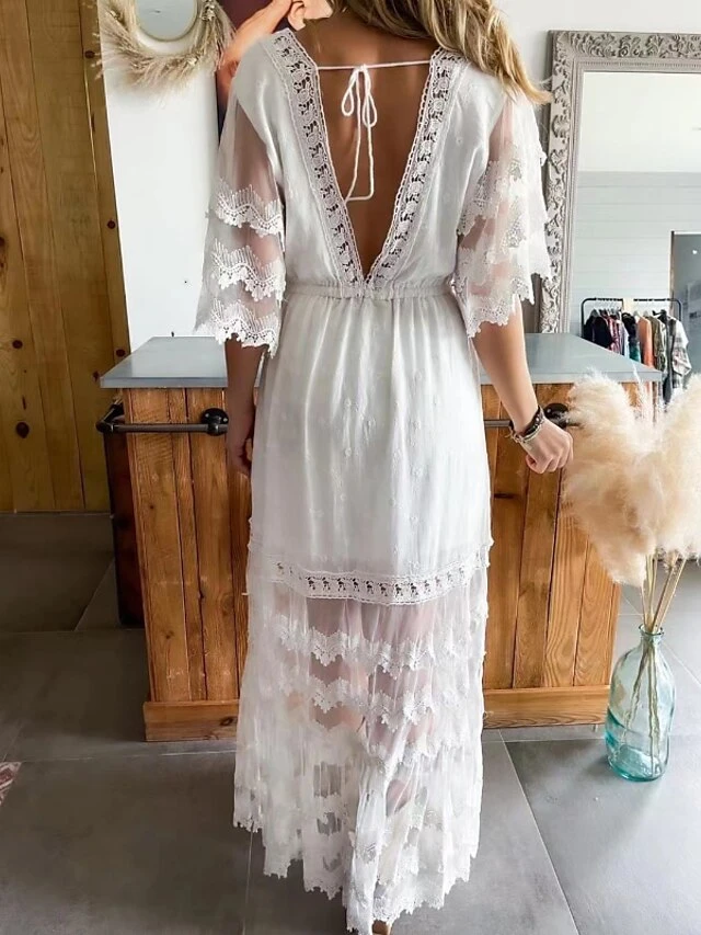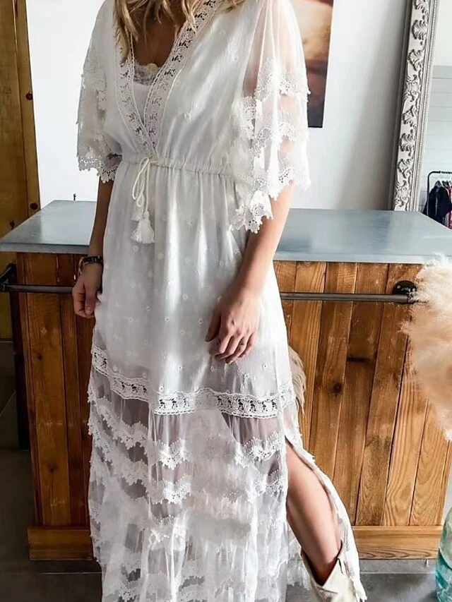 Women’s Party Dress A Line Dress Boho Dress Long Dress Maxi Dress White Half Sleeve Pure Color Lace Spring Fall Autumn V Neck Boho Loose Fit 2023 S M L XL XXL