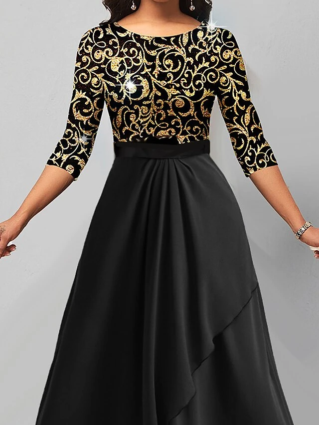 Women’s Party Dress Black Velvet Dress Long Dress Maxi Dress Black 3/4 Length Sleeve Floral Patchwork Spring Fall Winter Crew Neck Party
