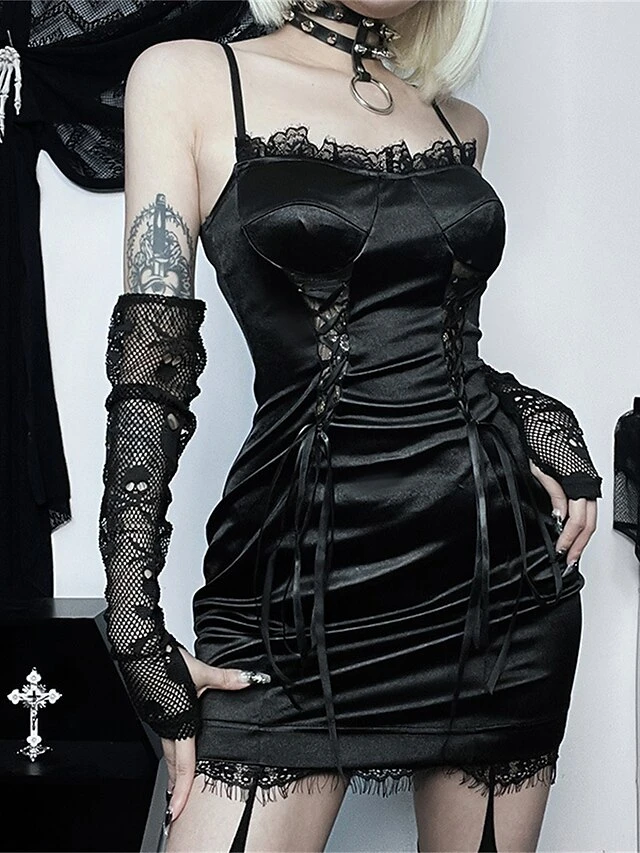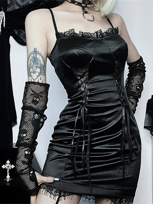 Women’s Party Dress Cocktail Dress Bodycon Mini Dress Black Sleeveless Pure Color Lace Up Spring Fall Winter Spaghetti Strap Fashion Halloween Birthday Wedding Guest 2023 S M L