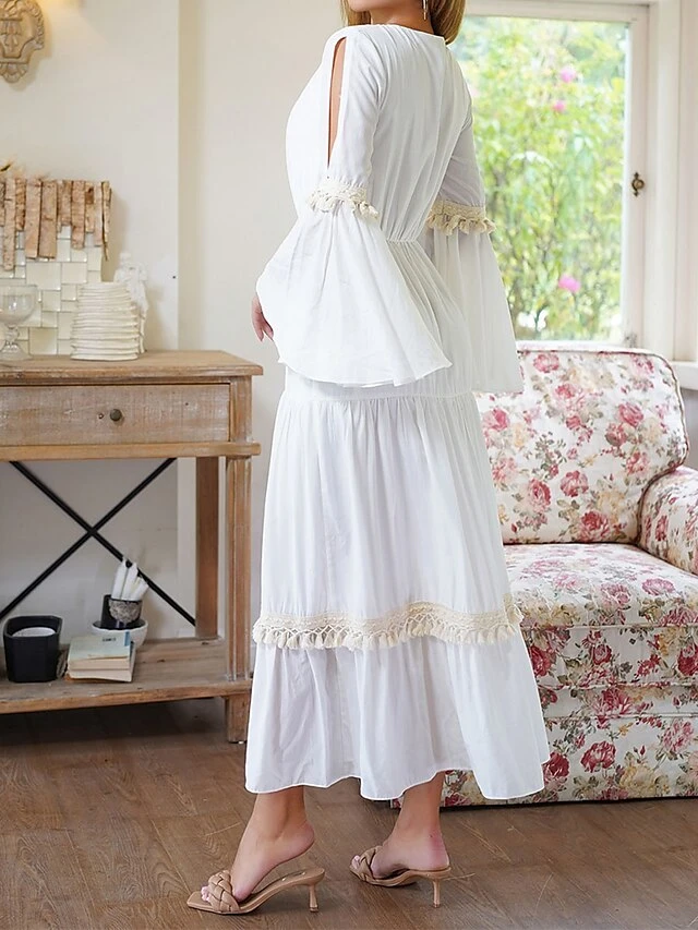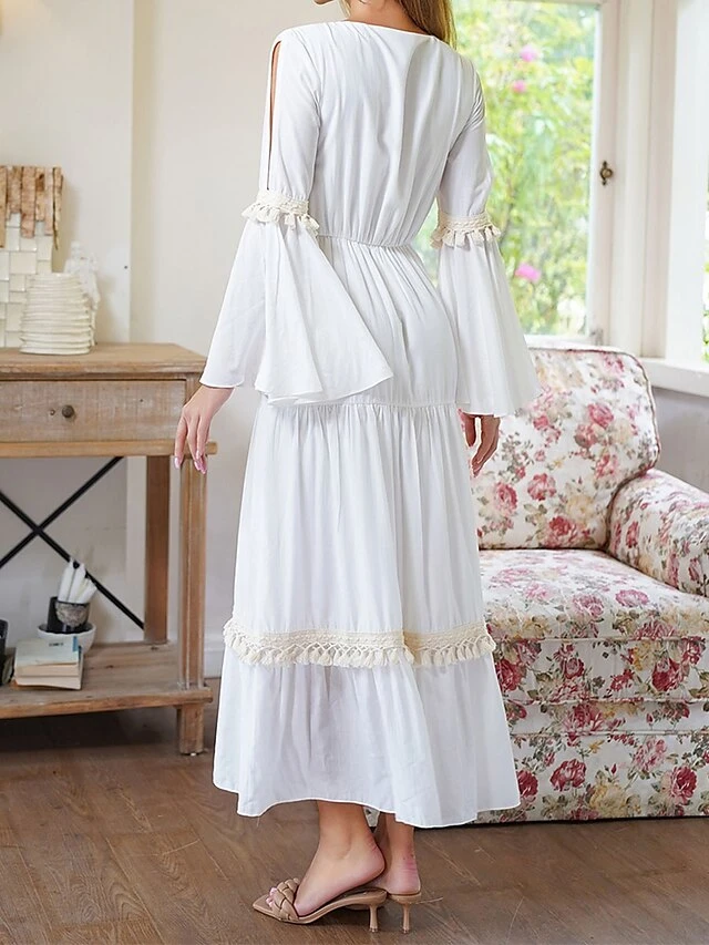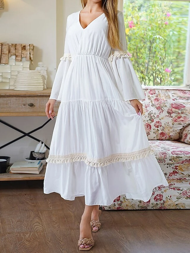 Women’s Party Dress Cocktail Dress Wedding Guest Dress Midi Dress White Long Sleeve Pure Color Tassel Fringe Fall Winter Autumn V Neck Fashion Birthday Wedding Guest Vacation 2023 S M L XL