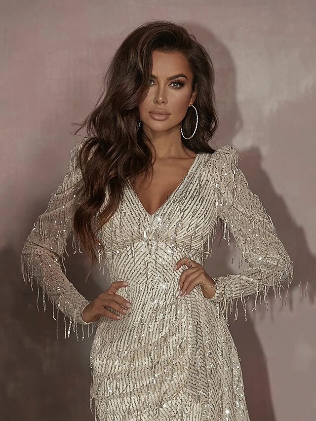 Women‘s Party Dress Fringe Dress Sequin Dress Homecoming Dress Mini Dress White Long Sleeve Pure Color Sequins Winter Fall Autumn V Neck Fashion Winter Dress Daily Evening Party 2022 S M L XL XXL