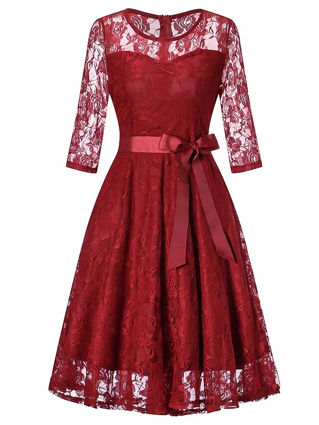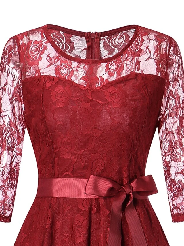 Women’s Party Dress Lace Dress Wedding Guest Dress Midi Dress Wine Navy Blue 3/4 Length Sleeve Pure Color Lace Summer Spring Fall Crew Neck Fashion Party Wedding Guest Vacation 2022 S M L XL XXL