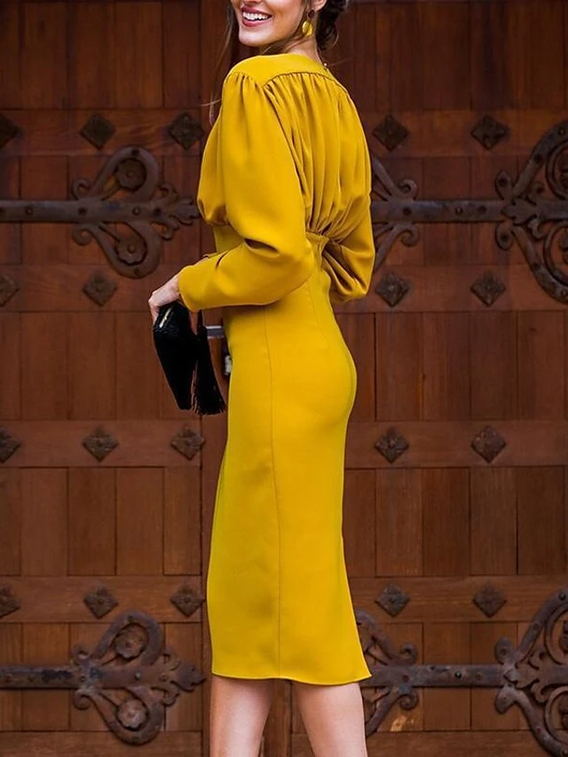 Women’s Party Dress Sheath Dress Midi Dress Yellow Long Sleeve Pure Color Ruched Winter Fall Autumn V Neck Casual Party Winter Dress Fall Dress 2022 S M L XL XXL