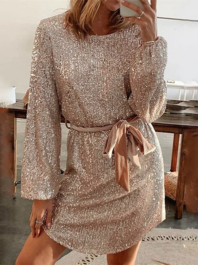 Women‘s Party Dress Wedding Guest Dress Sequin Dress Homecoming Dress Shift Dress Silver Gold White Long Sleeve Pure Color Sequins Winter Fall Autumn Crew Neck Party Winter Dress Birthday Loose Fit