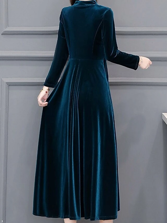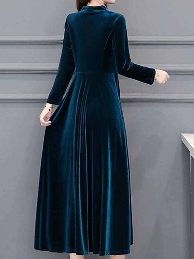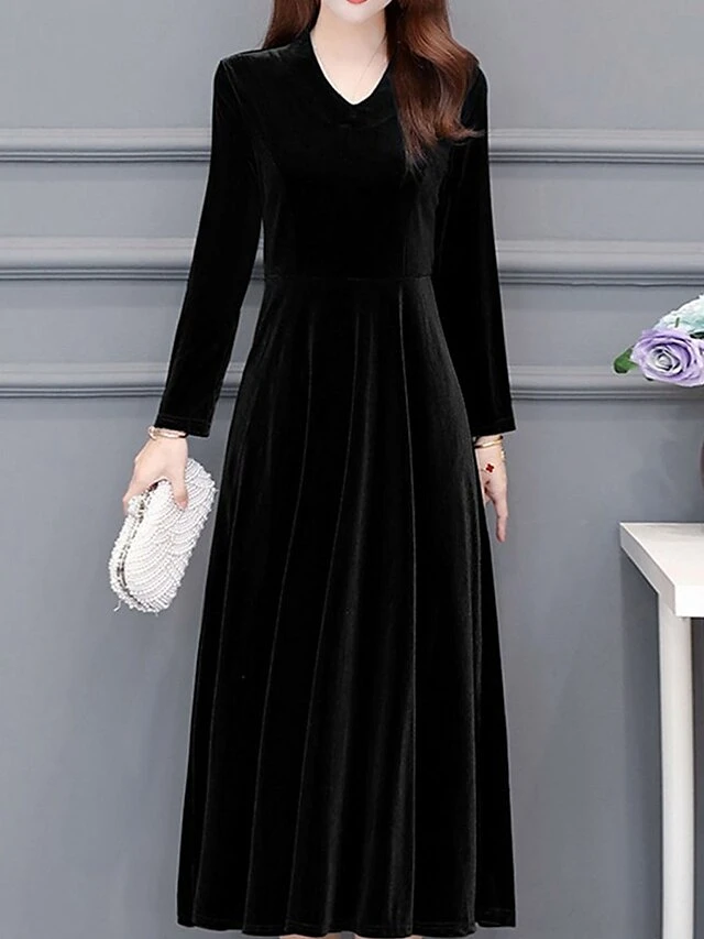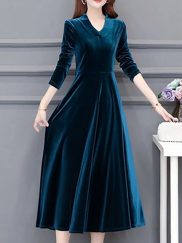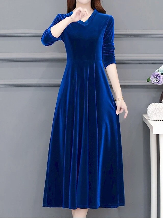 Women‘s Party Dress Wedding Guest Dress Velvet Dress Work Dress Midi Dress Black Wine Royal Blue Long Sleeve Pure Color Ruched Winter Fall Spring V Neck Fashion Spring Dress 2023 M L XL 2XL 3XL 4XL