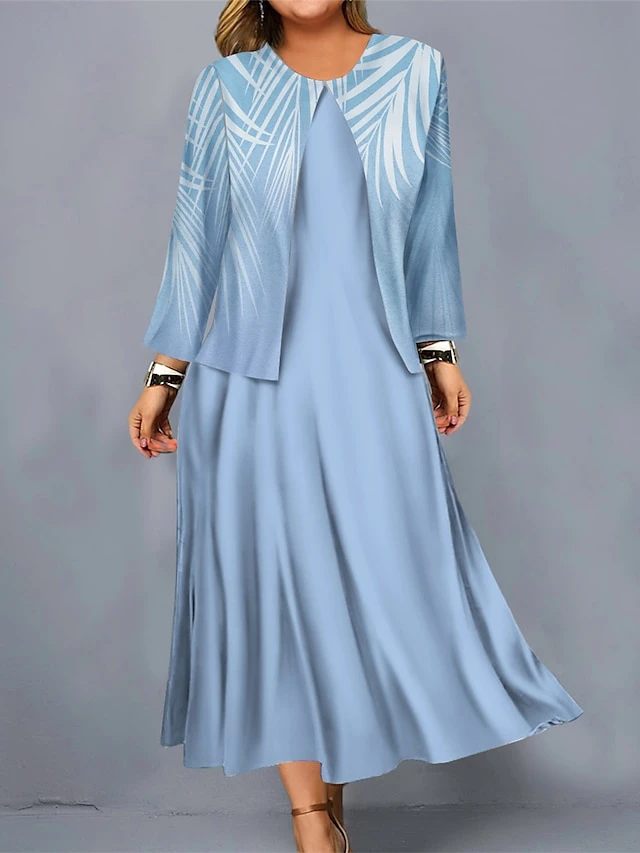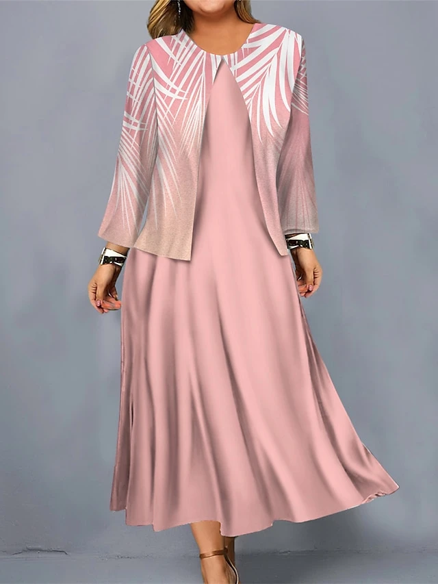 Women’s Plus Size Curve Casual Dress Dress Set Two Piece Dress Leaf Midi Dress Long Sleeve Print Crew Neck Mature Outdoor Pink Blue Fall Winter L XL XXL 3XL 4XL