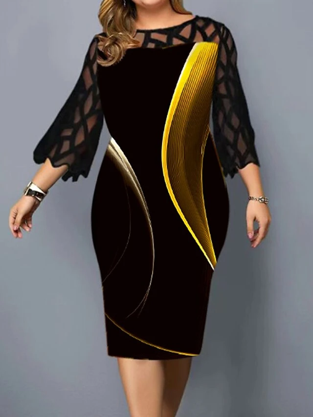 Women’s Plus Size Party Dress Cocktail Dress Bodycon Midi Dress Black 3/4 Length Sleeve Striped Lace Spring Fall Winter Crew Neck Fashion Wedding Guest Vacation 2023 L XL XXL 3XL 4XL 5XL