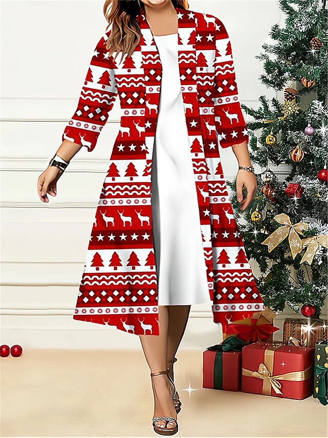 Women’s Plus Size Two Piece Dress Set Casual Dress Swing Dress Outdoor Office Fashion Streetwear Print Midi Dress Crew Neck 3/4 Length Sleeve Geometric Deer Regular Fit White Wine Red Fall Winter L
