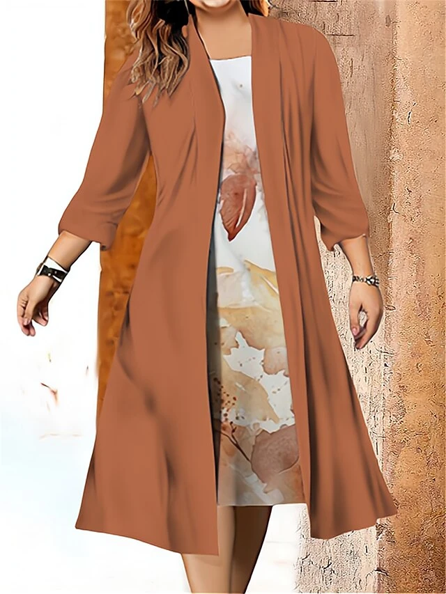 Women’s Plus Size Two Piece Dress Set Casual Dress Swing Dress Outdoor Office Fashion Streetwear Print Midi Dress Crew Neck 3/4 Length Sleeve Leaf Regular Fit Blue Camel Brown Fall Winter L XL XXL