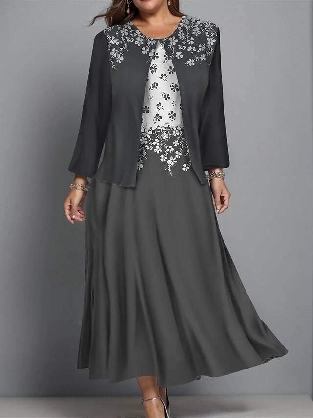 Women’s Plus Size Two Piece Dress Set Casual Dress Swing Dress Outdoor Office Fashion Streetwear Print Midi Dress Crew Neck Long Sleeve Floral Regular Fit Navy Blue Purple Gray Fall Winter L XL XXL