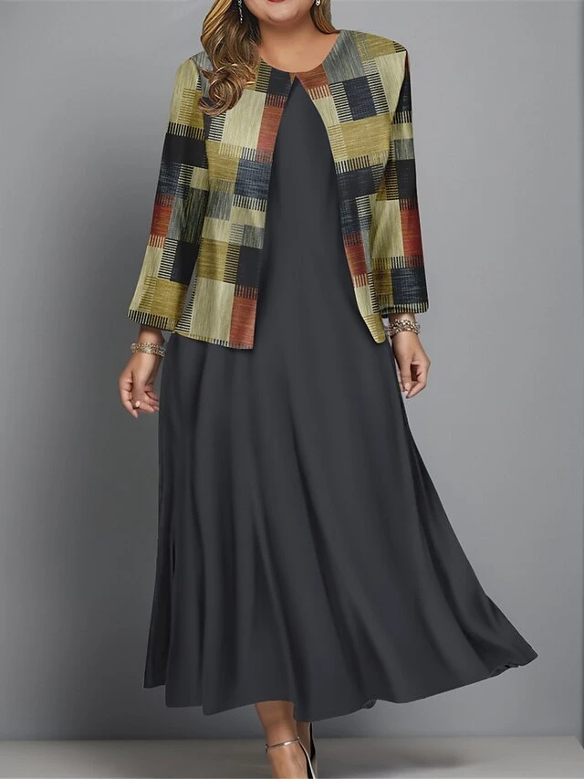 Women’s Plus Size Two Piece Dress Set Casual Dress Swing Dress Outdoor Office Fashion Streetwear Print Midi Dress Crew Neck Long Sleeve Plaid Regular Fit Black Blue Brown Fall Winter L XL XXL 3XL 4XL