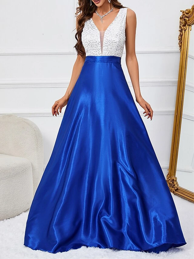 Women’s Prom Dress Party Dress Sequin Dress Long Dress Maxi Dress Blue Sleeveless Color Block Sequins Spring Fall Winter V Neck Fashion Wedding Guest Birthday Evening Party 2023 S M L XL