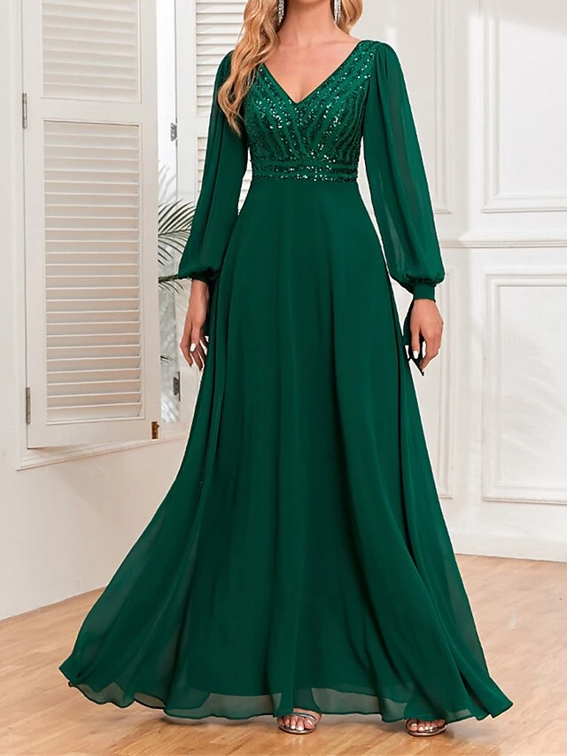 Women’s Prom Dress Party Dress Sequin Dress Long Dress Maxi Dress Green Long Sleeve Pure Color Sequins Fall Winter Autumn V Neck Fashion Wedding Guest Birthday Evening Party 2023 S M L XL