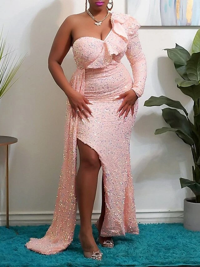 Women‘s Prom Dress Party Dress Sequin Dress Long Dress Maxi Dress White Pink Wine Long Sleeve Pure Color Sparkly Glitter Sequins Spring Fall Winter One Shoulder Fashion Winter Dress Wedding